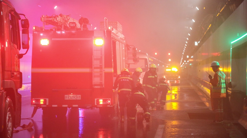 此次演練,市市政設(shè)施管理中心從實(shí)戰(zhàn)出發(fā),先后模擬了隧道發(fā)生交通事故的消防處置和防汛應(yīng)急處置兩個(gè)場景。在消防處置場景,模擬隧道內(nèi)發(fā)生交通事故,一輛小轎車因變更車道操作不當(dāng)與另一車道小車發(fā)生刮擦碰撞,導(dǎo)致兩車相撞起火并伴有濃煙冒出,情況危急。隧道監(jiān)控中心工作人員第一時(shí)間發(fā)現(xiàn)事故,更改隧道情報(bào)板信號(hào)燈、開啟廣播、開啟風(fēng)機(jī)排煙,并協(xié)同交警、醫(yī)護(hù)人員共同配合,高效救治傷員。在防汛應(yīng)急處置場景,模擬黃色暴雨預(yù)警情況下,按照市城管局防汛指揮部要求啟動(dòng)防汛三級(jí)響應(yīng),應(yīng)急處置人員封閉隧道,清理隧道收水口、使用排水車強(qiáng)排積水,積水消退后清理隧道路面恢復(fù)交通。
